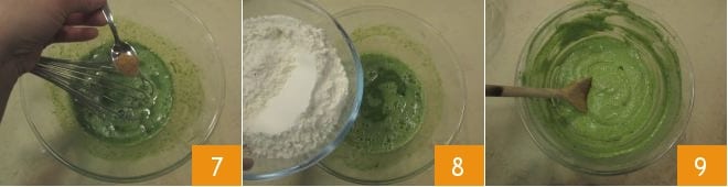 würzen Sie mit Muskatnuss 7. Fügen Sie nun nach und nach das Mehl hinzu 8 und rühren Sie mit einem Löffel, um es in die Masse einzubeziehen, ohne Klumpen zu bilden. Stellen Sie die Spätzle-Masse beiseite 9.