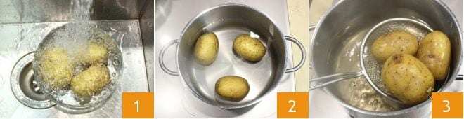 Um die gratinierten Gnocchi-Spieße zuzubereiten, beginnen Sie mit der Herstellung der weißen Gnocchi (für weitere Details siehe das Rezept Kartoffelgnocchi). Waschen Sie die Kartoffeln 2 und legen Sie sie ungeschält in einen Topf mit Salzwasser, lassen Sie sie etwa 25-30 Minuten kochen 2, bis sie weich sind, und dann abtropfen lassen 3.