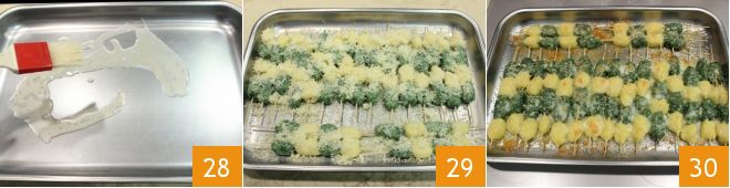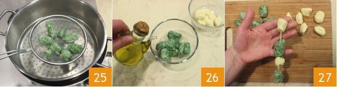 Kochen Sie die grünen Gnocchi auf die gleiche Weise, dann lassen Sie sie abtropfen 25, legen Sie sie in eine Schüssel und würzen Sie sie mit etwas Öl 26. Nun können Sie die Spieße zusammenstellen: Nehmen Sie einen Holzspieß und stecken Sie die Spieße abwechselnd mit weißen und grünen Gnocchi auf 27.