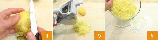 Schälen Sie sie noch heiß 4, zerdrücken Sie sie mit einer Kartoffelpresse 5 und legen Sie sie mit dem Mehl auf eine Arbeitsfläche 6