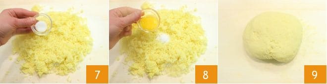 Machen Sie eine kleine Mulde und fügen Sie in die Mitte das Salz 7 und das Eigelb 8 hinzu und kneten Sie alles, bis Sie eine kompakte Masse erhalten. Kneten Sie weiter, bis der Teig glatt und klumpenfrei ist 9.
