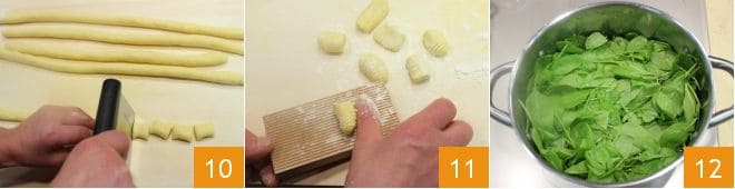 Teilen Sie den Teig in mehrere Stränge mit einem Durchmesser von 2-3 Zentimetern und beginnen Sie, Ihre Gnocchi zu schneiden 10. Zum Schluss ziehen Sie jeden Gnocchi über das gezahnte Holzbrettchen 11 oder mit einer Gabel, um die typischen Rillen zu erzeugen. Nun kümmern Sie sich um die grünen Gnocchi (für alle Details siehe das Rezept: Grüne Gnocchetti) waschen Sie den Spinat und kochen Sie ihn in wenig Salzwasser 12. In einem anderen Topf kochen Sie die Kartoffeln, indem Sie sie mit Schale wie bei den klassischen Gnocchi kochen.