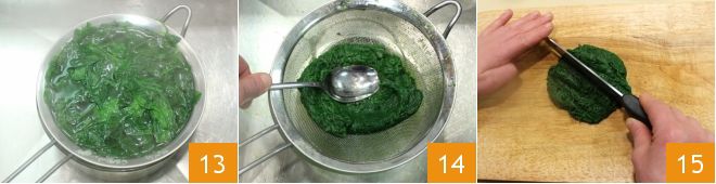 Nach dem Kochen lassen Sie den Spinat abtropfen und drücken Sie ihn gut mit einem Sieb aus (13-14), dann hacken Sie ihn fein mit einem Messer 15.
