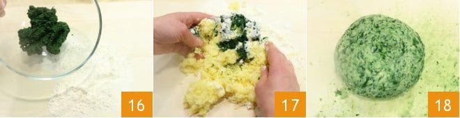 Auf einer Arbeitsfläche geben Sie das Mehl, den Spinat 16, die geschälten und zerdrückten Kartoffeln und kneten alles 17, bis Sie eine kompakte Masse erhalten 18.
