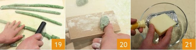 Fahren Sie fort wie zuvor: Teilen Sie den Teig in mehrere Stränge mit einem Durchmesser von 2-3 Zentimetern und beginnen Sie, Ihre Gnocchi mit einem Teigschneider zu schneiden 19. Zum Schluss erzeugen Sie die typischen Rillen 20. Legen Sie die fertigen Gnocchi auf ein mit einem bemehlten Tuch ausgelegtes Tablett. Reiben Sie in einer Schüssel den Montasio 21 und den Grana.