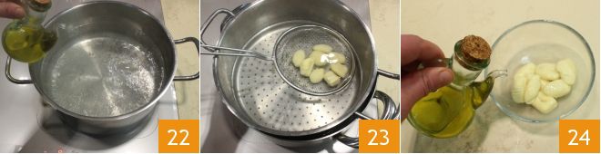 Kochen Sie alle weißen Gnocchi in Salzwasser mit einem Schuss Olivenöl 22, lassen Sie sie abtropfen, sobald sie an die Oberfläche steigen, das dauert ein paar Minuten, dann lassen Sie sie abtropfen 23, legen Sie sie in eine Schüssel und würzen Sie sie mit einem Schuss Olivenöl 24.