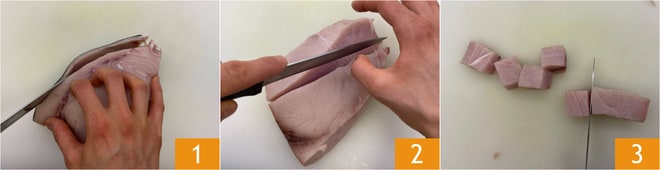 Um die Fischspieße zuzubereiten, entfernen Sie zuerst die Haut vom Schwertfischstück 1, schneiden Sie es zuerst in Streifen 2 und dann in Würfel von 3 cm Seite 3.