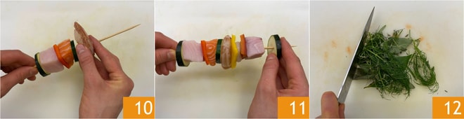 Setzen Sie die Spieße zusammen, indem Sie die Zutaten abwechseln, zum Beispiel: beginnen Sie mit einer Zucchinischeibe, fahren Sie dann mit Schwertfisch, roter Paprika, Lachs, wieder Zucchini, Garnele 10, gelber Paprika, Sepie, roter Paprika, Schwertfisch und schließlich Zucchini fort 11. Hacken Sie Dill, Lorbeer, Rosmarin, Salbei und Thymian fein 12. Mit diesen Mengen erhalten Sie 8 Spieße.