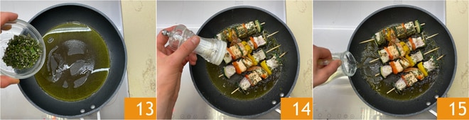 Geben Sie in eine Pfanne etwas Öl und fügen Sie die gehackten aromatischen Kräuter hinzu 13, lassen Sie sie eine Minute lang einziehen. Legen Sie die Spieße in die Pfanne und lassen Sie sie etwa 1 Minute auf jeder Seite anbraten. Würzen Sie mit Salz und Pfeffer 14, dann löschen Sie mit Weißwein ab 15.
