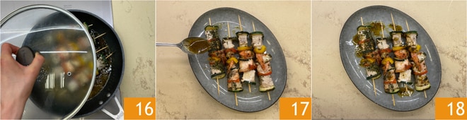 Wenn der gesamte Alkohol verdampft ist, decken Sie mit einem Deckel ab und lassen Sie bei niedriger Hitze 10-15 Minuten kochen 16. Anrichten und mit dem Kochfond würzen 17. Ihre Fischspieße sind bereit, genossen zu werden 18.