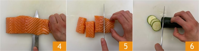 Entfernen Sie die Haut des Lachses 4 und schneiden Sie auch diesen in Würfel derselben Größe 5. Schneiden Sie die Zucchini in Scheiben 6.