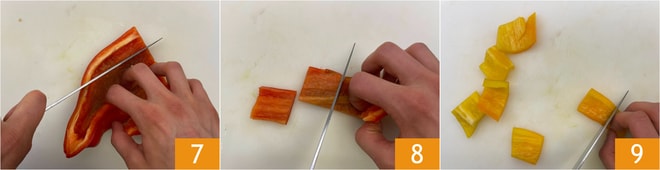 Entfernen Sie den Stiel, die Samen und die inneren Fasern der Paprika, dann schneiden Sie sie zuerst in Streifen 7 und dann in Quadrate von 3 cm Seite 8 9. Schälen Sie auch die Garnelen.