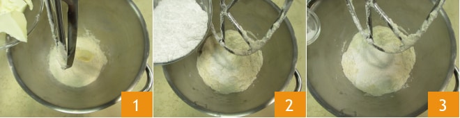 Um die Spiegelei-Torte vorzubereiten, beginnen Sie mit dem Mürbeteig. Sie können mit der Küchenmaschine oder von Hand in der gleichen Reihenfolge arbeiten. Geben Sie dann Mehl und kalte Butter in Stücken in die Schüssel 1. Verarbeiten Sie die Zutaten mit dem Flachrührer für ein paar Minuten, bevor Sie den Puderzucker 2 und das Salz 3 hinzufügen.
