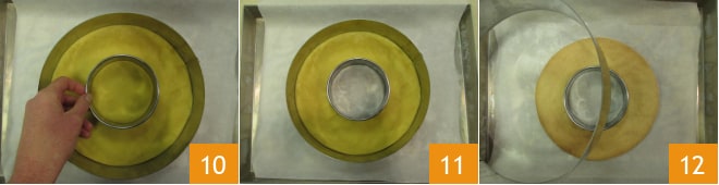 Auf einer der beiden Scheiben machen Sie ein Loch mit einem kleineren Ausstecher von 10 cm Durchmesser 10 und entfernen den Mürbeteig in der Mitte, lassen aber den Ring, der die Form halten soll 11. Backen Sie dann die beiden Scheiben in einem statischen Ofen bei 180° für 15 Minuten; entfernen Sie die Formen, wenn die Scheiben abgekühlt sind 12.