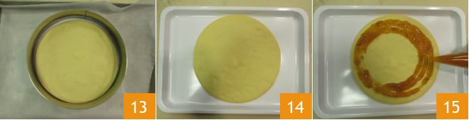 Machen Sie dasselbe mit der anderen Scheibe 13. Wenn die Böden vollständig abgekühlt sind, fahren Sie mit der Zusammensetzung fort 14. Auf die geschlossene Scheibe geben Sie die Aprikosenmarmelade, die Sie mit einem Löffel oder einem Spritzbeutel verteilen 15.