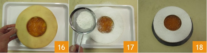 Legen Sie die zweite gelochte Scheibe darauf und drücken Sie leicht mit den Fingern, damit sie gut haftet 16. Dekorieren Sie die Oberfläche mit reichlich Puderzucker, ohne sich zu sorgen, wenn er auf die Marmelade fällt, denn er wird dann absorbiert 17 und Ihre Spiegelei-Torte ist fertig 18.