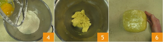 Verarbeiten Sie die Zutaten erneut, um einen sandigen Teig zu erhalten. Fügen Sie auch die ganzen Eier und die Eigelbe hinzu 4. Lassen Sie die Küchenmaschine noch ein paar Augenblicke arbeiten, bis der Teig homogen ist 5. Übertragen Sie den Teig auf die Arbeitsfläche, arbeiten Sie ihn schnell durch, um ihn zu festigen, formen Sie dann einen Block, wickeln Sie ihn in Frischhaltefolie ein und lassen Sie ihn mindestens eine Stunde im Kühlschrank ruhen 6.