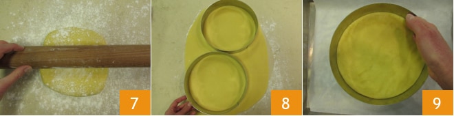 Nach der Ruhezeit rollen Sie den Mürbeteig auf einer leicht bemehlten Arbeitsfläche auf eine Dicke von ½ cm aus 7. Mit einem Backring erhalten Sie zwei Scheiben mit einem Durchmesser von 22 cm 8 und legen die Formen auf zwei mit Backpapier ausgelegte Bleche 9.