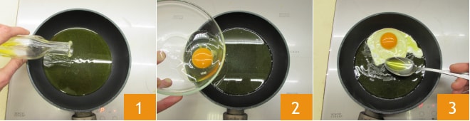 Um Spiegeleier zuzubereiten, empfehlen wir die Verwendung einer beschichteten Pfanne. Gießen Sie so viel Öl hinein, dass der gesamte Boden bedeckt ist 1. Erhitzen Sie es und geben Sie dann ein Ei, das Sie in eine Schüssel aufschlagen, in die Pfanne 2. Kochen Sie es bei mittlerer bis hoher Hitze und neigen Sie die Pfanne gelegentlich, um das Öl mit einem Löffel aufzufangen und die Oberfläche zu beträufeln 3.