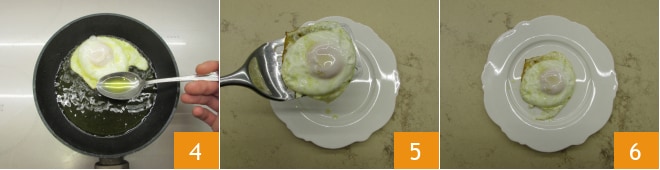 Fahren Sie so fort, bis sich eine weiße Schicht auf der Oberfläche gebildet hat 4. In etwa 2-3 Minuten ist das Spiegelei fertig 5, servieren Sie es nach Belieben mit Salz und Pfeffer 6.