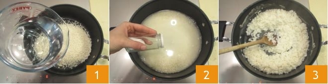 Um die Spinat-Arancini zuzubereiten, beginnen Sie mit der Reiszubereitung: Geben Sie den Reis in einen großen Topf, fügen Sie 1 Liter Wasser 1 und das Salz 2 hinzu und kochen Sie den Reis etwa 25 Minuten: Am Ende sollte der Reis gut trocken sein 3.