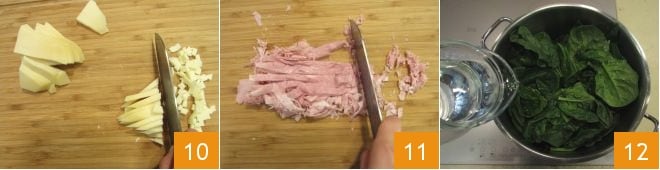 Bereiten Sie in der Zwischenzeit die Zutaten für die Füllung vor: Schneiden Sie den Caciocavallo in sehr kleine Würfel 10 und hacken Sie den gekochten Schinken fein 11. Spülen Sie den Spinat gründlich ab und geben Sie ihn in einen großen Topf, salzen Sie und fügen Sie etwa 200 g Wasser hinzu 12.