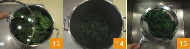 Decken Sie den Topf mit einem Deckel ab 13 und kochen Sie auf niedriger Flamme, bis sie verwelkt sind: Das dauert etwa 5-7 Minuten 14. Den Spinat abtropfen lassen, um das überschüssige Wasser zu entfernen 15, und abkühlen lassen.