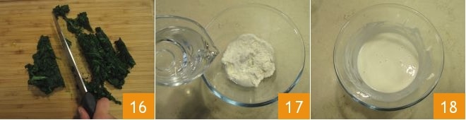 Sobald der Spinat abgekühlt ist, fein hacken 16. Bereiten Sie nun den Teig vor: In einer Schüssel Wasser mit Mehl vermischen 17 und gut mit einem Schneebesen umrühren, um Klumpenbildung zu vermeiden, bis eine homogene Mischung entsteht 18.
