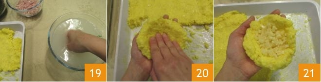 Wenn der Reis gut abgekühlt ist, können Sie mit der Zusammenstellung der Arancini beginnen: Um Ihnen zu helfen, halten Sie eine Schüssel mit Wasser bereit, um Ihre Hände nach Bedarf zu befeuchten 19. Nehmen Sie etwa 180-200 g Reis auf einmal, drücken Sie ihn in Ihrer Handfläche und formen Sie eine Art Mulde 20, fügen Sie dann einen Löffel Caciocavallo-Würfel hinzu 21,
