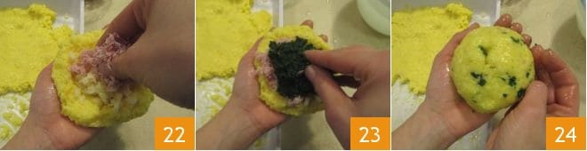 einen Löffel gehackten Schinken 22 und einen Löffel Spinat 23. Formen Sie den Reis zu einer Kugel, indem Sie die Füllung nach innen drücken, um sicherzustellen, dass sie nicht herauskommt 24. Sobald Sie alle Arancini geformt haben, das Pflanzenöl in einem Topf erhitzen und auf 140°C bringen.