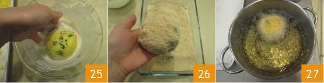 Tauchen Sie einen Arancino nach dem anderen in den Teig 25, dann mit Semmelbröseln bedecken 26 und im heißen Öl etwa 5-7 Minuten lang frittieren 27. Es wird nicht empfohlen, mehr als ein Stück gleichzeitig zu frittieren, um zu verhindern, dass die Öltemperatur sinkt.