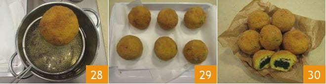 Wenn die Arancini schön goldbraun sind, abtropfen lassen 28 und auf ein Blatt Küchenpapier oder saugfähiges Papier legen, um das überschüssige Öl zu entfernen 29. Ihre Spinat-Arancini sind fertig und können noch heiß genossen werden 30!