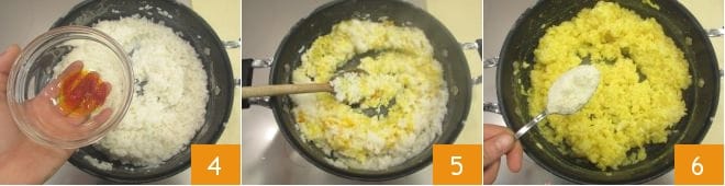 Schalten Sie dann die Hitze aus und fügen Sie den Safran hinzu, den Sie in einer kleinen Menge Reis-Kochwasser aufgelöst haben 4, gut umrühren 5, dann den Parmesankäse hinzufügen 6