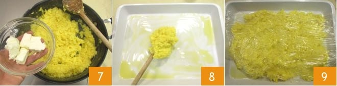 und die Butter 7 und nochmals gut umrühren, um alles gut zu vermischen. Den Reis auf ein mit Öl eingefettetes Tablett verteilen 8 und gleichmäßig verteilen, um das Abkühlen zu erleichtern, dann mit Frischhaltefolie abdecken 9 und im Kühlschrank mindestens 2 Stunden abkühlen lassen.