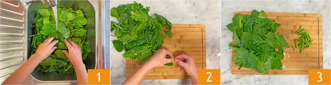 Um den Spinat in der Pfanne zuzubereiten, waschen Sie zuerst die Spinatblätter 1. Entfernen Sie den härteren Teil des Stiels 2 3.