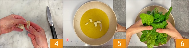 Schälen Sie die Knoblauchzehen, halbieren Sie sie und entfernen Sie den inneren Kern 4. Geben Sie das native Olivenöl extra zusammen mit den Knoblauchzehen in eine große Pfanne und erhitzen Sie es bei mittlerer Hitze 5. Jetzt fügen Sie den gewaschenen Spinat hinzu 6.