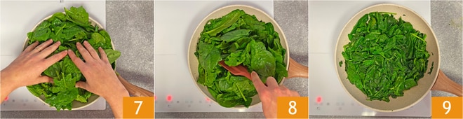 Geben Sie den gesamten Spinat in die Pfanne, auch wenn er sehr voluminös ist 7, er wird in kurzer Zeit zusammenfallen. Decken Sie die Pfanne mit einem Deckel ab und lassen Sie den Spinat 5 Minuten bei starker Hitze kochen. Nehmen Sie den Deckel ab, salzen und pfeffern Sie, und rühren Sie mit einem Spatel um 8. Setzen Sie das Garen bei mittlerer Hitze für weitere 10 Minuten fort, bis der Spinat in der Pfanne gekocht ist 9.