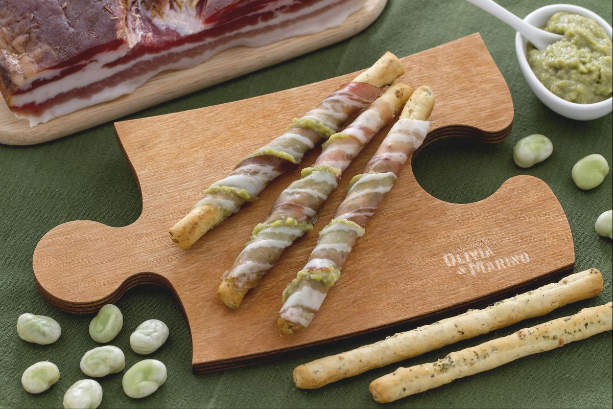Sobald die Stange mit dem Favabohnenpüree bestrichen ist, wickeln Sie eine Scheibe Speck darum 10, wobei Sie ein Ende der Stange frei lassen 11. Wiederholen Sie diesen Vorgang mit allen Stangen. Ihre Stangen mit Favabohnenpüree und Speck sind fertig und können serviert werden! 12