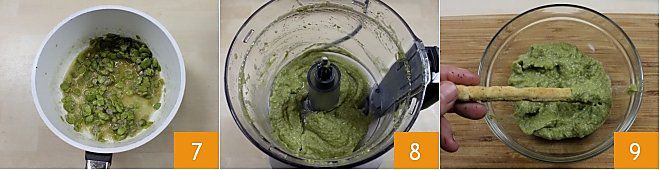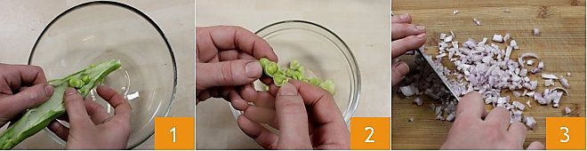 Um die Stangen mit Favabohnenpüree und Speck zuzubereiten, beginnen Sie damit, die Favabohnen zu schälen 1 und die härtere äußere Schale zu entfernen 2. Hacken Sie die Schalotte 3,