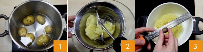 Um die Stangen mit zarter Trüffelcreme zuzubereiten, beginnen Sie mit der Kartoffelcreme: Waschen Sie sie unter fließendem Wasser, um den Schmutz zu entfernen, dann legen Sie sie in einen großen Topf und bedecken sie mit Wasser 1. Kochen Sie sie etwa 40 Minuten oder bis Sie sie mit den Zinken einer Gabel einstechen können. Nach dem Kochen schälen Sie sie und passieren sie durch ein Passiergerät 2, indem Sie das Fruchtfleisch in einer kleinen Schüssel sammeln. Salzen und pfeffern Sie nach Belieben und geben die Kartoffelpüree in einen großen Topf und fügen Sie den geriebenen Muskatnuss hinzu 3.