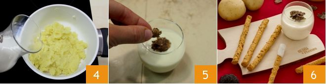 Gießen Sie nun die warme Milch oder die warme Sahne nach und nach in einem dünnen Strahl hinzu 4, rühren Sie mit einem Holzlöffel um und kochen Sie bei niedriger Hitze weiter, bis die Creme eingedickt ist (sie sollte den Löffel überziehen). Sollte sie zu fest werden, können Sie noch etwas Milch oder Sahne hinzufügen. Sobald sie fertig ist, füllen Sie sie in die Gläschen (Sie können 125 ml Gläschen oder einen einzigen Behälter verwenden) und fügen die Scheiben schwarzen Trüffel hinzu 5. Servieren Sie dann Ihre Stangen begleitet von der zarten Trüffelcreme 6!