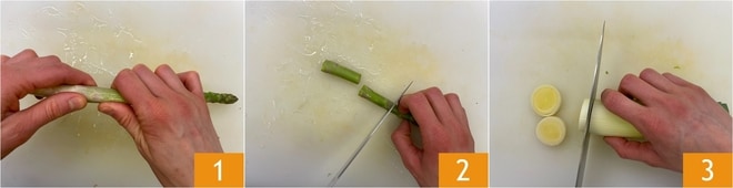 Um den Steinbutt im Ofen zuzubereiten, heizen Sie zuerst den Ofen auf 200° vor. Reinigen Sie die Spargel, indem Sie das holzige weiße Ende entfernen 1; sollten sie zu hart sein, schälen Sie die Stiele, um sie zu verdünnen (bei frischem Spargel ist das nicht nötig). Schneiden Sie die Stiele in Stücke 2 und verarbeiten Sie dann den Lauch: Schneiden Sie die Basis ab, entfernen Sie die äußeren Blätter und schneiden Sie ihn in etwa einen halben Zentimeter dicke Ringe 3.
