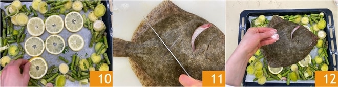 Verschieben Sie das Gemüse, um in der Mitte der Form Platz zu schaffen, und legen Sie dort die Zitronenscheiben hin 10; so wird der Steinbutt schonender gegart und verhindert, dass er austrocknet. Schneiden Sie ein Kreuz in die Haut auf dem Rücken des Steinbutts 11, dann legen Sie ihn auf die Zitronenscheiben 12 und salzen die Oberfläche.