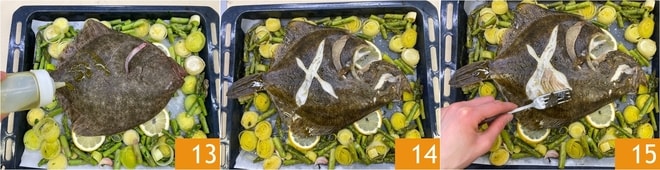 Mit einem Schuss Olivenöl extra vergine 13 würzen und für etwa 25-30 Minuten bei 200° backen 14. Der Steinbutt ist fertig, wenn sich die Haut leicht mit einer Gabel abheben lässt 15.