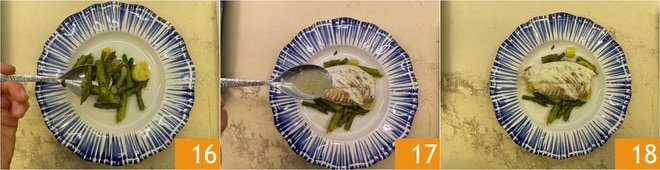 Richten Sie den Teller an, indem Sie das Gemüse als Basis verteilen 16, dann legen Sie das Steinbuttfilet darauf und würzen es mit dem Bratensaft 17. Ihr Steinbutt im Ofen ist servierbereit 18!