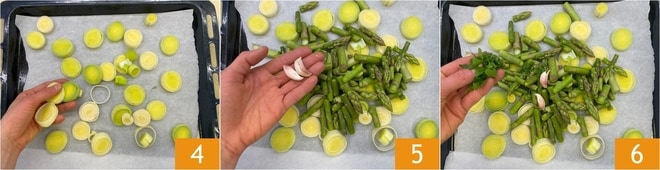 Verteilen Sie den Lauch 4 und den Spargel in einer mit Backpapier ausgelegten Auflaufform, würzen Sie dann mit 2 ganzen Knoblauchzehen 5 und der Petersilie 6.
