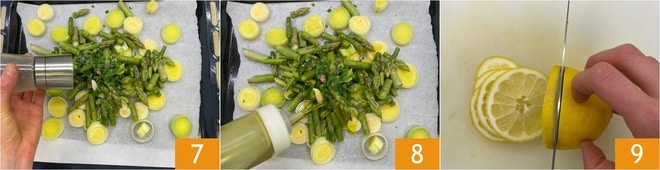 Salzen 7, pfeffern und mit einem Schuss Öl 8 würzen. Schneiden Sie eine Zitrone dünn 9.
