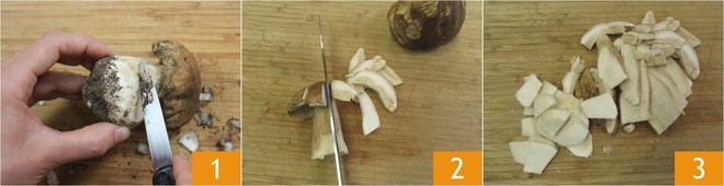 Um den Steinpilz- und Parmesan-Salat zuzubereiten, kümmern Sie sich zunächst um die Reinigung der Pilze: Kratzen Sie mit einem glatten Küchenmesser vorsichtig den erdigen Teil des Stiels ab 1, entfernen Sie dann die Rückstände mit einem Pinsel oder einem Baumwolltuch. Schneiden Sie die gereinigten Pilze in dünne Scheiben in Längsrichtung 2 3.