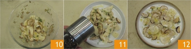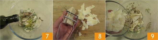 Würzen Sie mit Salz, Pfeffer und einem großzügigen Schuss extra nativem Olivenöl 7. Schließlich machen Sie Parmigiano Reggiano DOP-Späne 8 und mischen sie unter die Pilze 9.