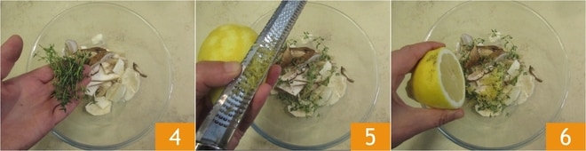 Übertragen Sie die Steinpilze in eine Schüssel und fügen Sie die Thymianzweige 4, die Zitronenschale 5 und den Zitronensaft 6 hinzu.